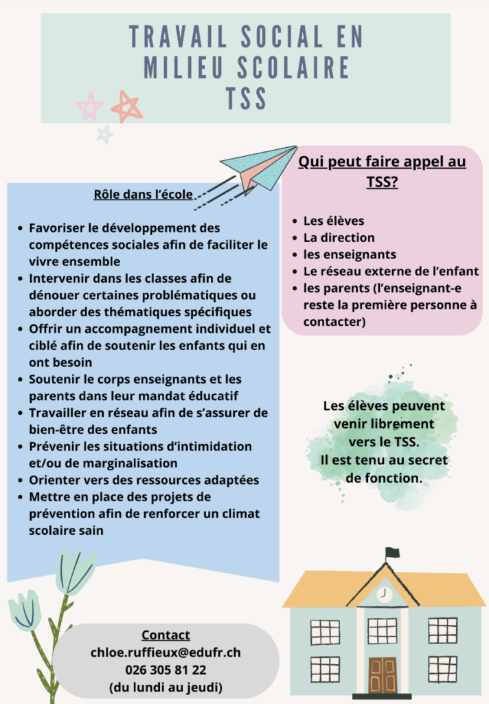 Pour le cercle scolaire de Corbières-Hauteville, il s’agit de Mme Chloé Ruffieux à partir du 1er février 2026. Elle peut intervenir à la demande des enseignants, de la direction et des parents. Les élèves peuvent venir librement vers elle.